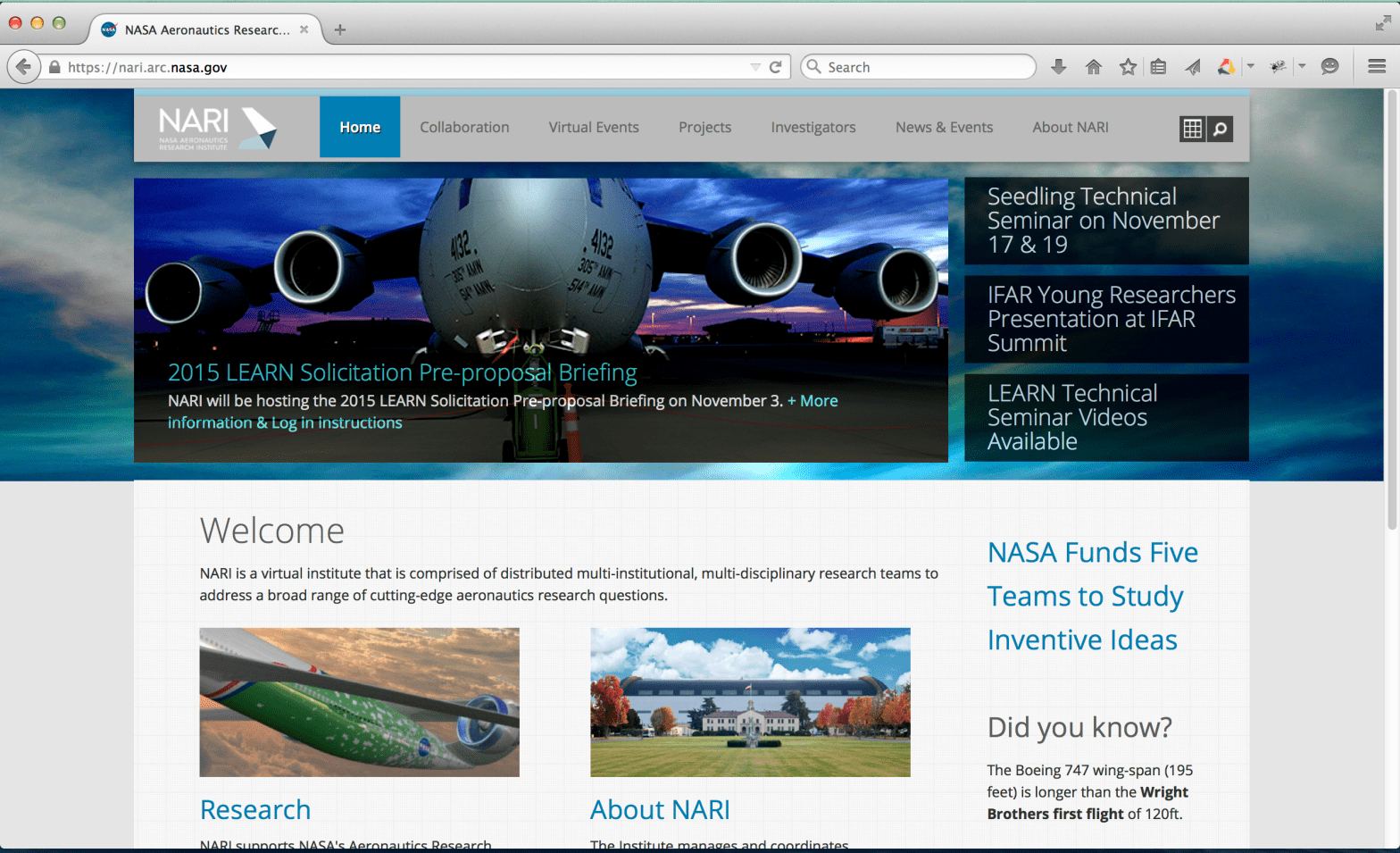 NASA Aeronautics Research Institute (NARI) website Customized the existing responsive Drupal theme to match Photoshop mockups I created